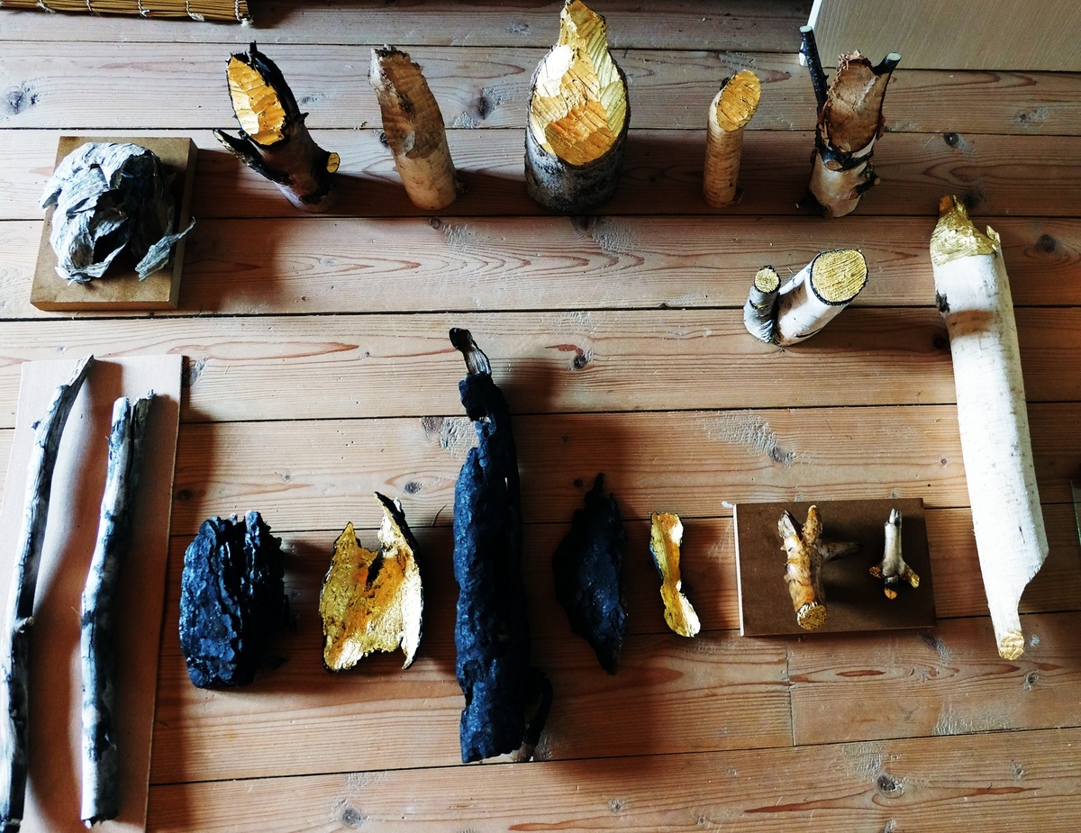 Gyllene snitt - funna material av trä; brunnen bark, bävergnagda pinnar, segment av träd där snitten är belagda med 23 k bladguld. 2016 år © Victoria Brännström